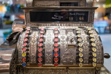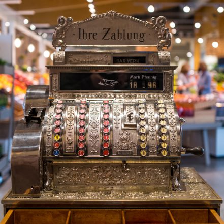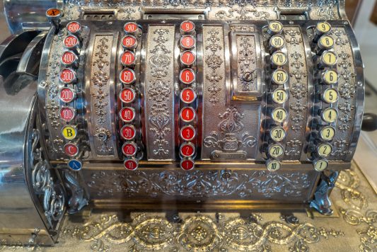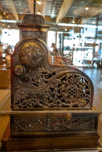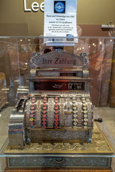 Die Geschichte der Registrierkasse begann 1879 in den USA. Der Geschäftsmann James Ritty entwickelte mit seinem Bruder die erste Kasse, um sichere Erkenntnisse über die Geschäftsvorgänge in seinem Verkaufsladen zu erhalten. Die Idee zur Konstruktion einer Kasse kam ihm während einer Schiffsreise, als er eine Vorrichtung sah, die die Umdrehung der Schiffsschraube zählte. Den Brüdern Ritty gelang es jedoch nicht, Kassen in größeren Mengen zu verkaufen. Sie scheiterten an dem Misstrauen der Verkäufer gegenüber diesen “Diebesfängern”. Nach mehreren erfolglosen Versuchen einiger Geschäftsleute, die Kasse auf dem Markt durchzusetzen, erwarb der Händler John H. Patterson 1884 die Rechte für die Kassenherstellung und gründete die National Cash Register Company (NCR). Als einer der ersten Industriellen richtete er eine Verkäuferschule ein, lehrte Verkaufstechniken und hielt Verkaufsbesprechungen. Mit gezielten Werbekampagnen und ausgebildeten Vertretern gelang es nun, die Registrierkassen im Einzelhandel bekannt zu machen. Innerhalb weniger Jahre entwickelte sich NCR zum weltweit führenden Hersteller von Registrierkassen. Neben der neuen Werbestrategie war die technische Weiterentwicklung der Kassen ein Grund für den Erfolg. Kassen, die Quittungen ausdruckten, kamen 1892 auf den Markt. Auch die historische Kasse, ausgestellt bei Prechtl, kann Quittungen drucken. Sie ist auch heute noch voll funktionsfähig. Verborgen hinter einem eigens dafür vorgesehenen Schloß konnte nur der Chef die Tagesumsätze ablesen.