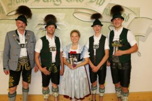 Vorstand Paul Kink vom Trachtenverein „Edelweiß“ Niederaschau (links) und die Sieger Stefan Thaurer (Altersklasse) Theresa Reiter (Aktive Dirndl), Marinus Kirchlechner (Aktive Buam I) und Toni Reiter (Aktive Buam II)