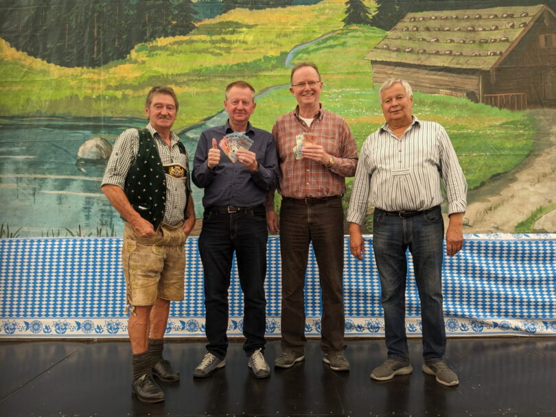 Wenn in der Gemeinde Aschau i. Chiemgau der traditionsreiche Aschauer Markt abgehalten wird, dann gehört seit vielen Jahren auch ein Preisschafkopfen dazu. Heuer fanden sich 22 Partien mit 88 Frauen und Männern ein, um ihr Glück und Können einzusetzen. Sieger mit dem besten Blatt und mit 97 Punkten wurde Franz Wittmann aus Bruckmühl (2. v.r.) vor Fritz Schauer aus Thansau (2.v.l.). Unsere Aufnahme zeigt die Gewinner mit Festwirt Werner Heinrichsberger (re.) und Spielleiter Hans Winkler nach der Siegerehrung auf der Festzeltbühne.