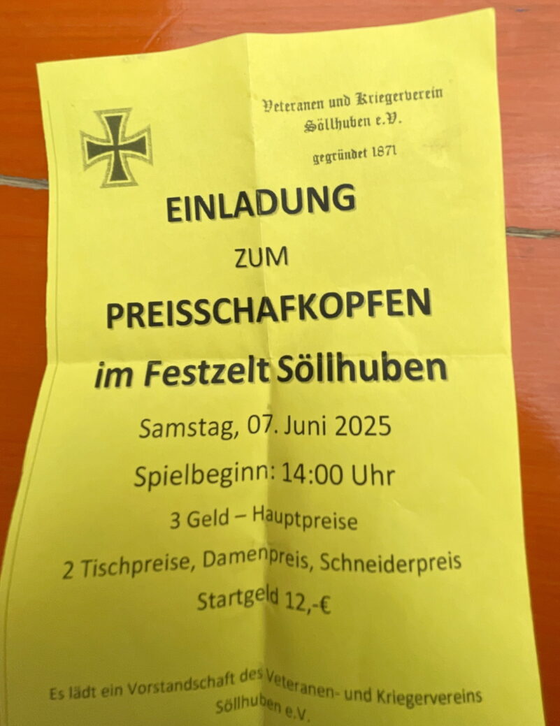 Der Veteranen- und Kriegerverein von Söllhuben lädt am Samstag, 7. Juni zu einem Preisschafkopfen ins Festzelt nach Söllhuben ein.