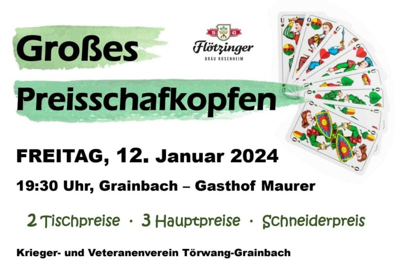 Zu einem Preisschafkopfen lädt der Krieger- und Veteranenverein Törwang-Grainbach am kommenden Freitag, 12. Januar 2024, ein.