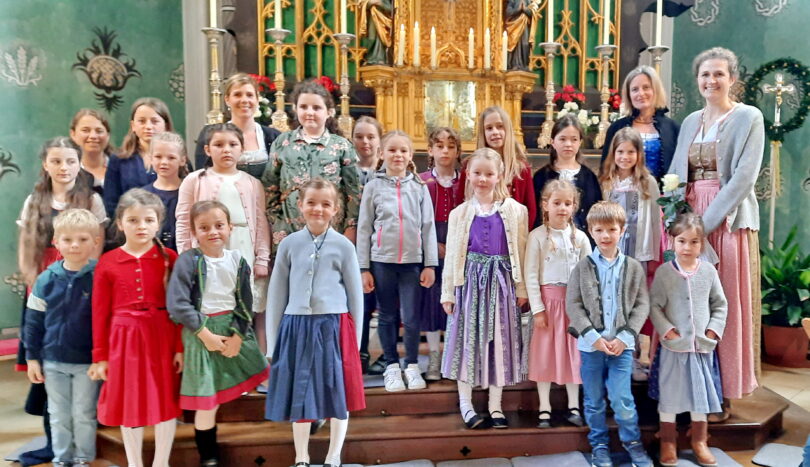 22 Kinder im Alter von 5 bis 12 Jahre probten die letzten Wochen im Pfarrzentrum für die Feier der ersten heiligen Kommunion in der Pfarrkirche St. Nikolaus in Übersee. In den insgesamt 6 Proben wurde fleißig gesungen, gespielt und vieles ausprobiert. Körperwahrnehmungs- und Rhythmusübungen, Sing- und Stimmtraining, Konzentration und Ausdauer, um nur einige der wichtigsten Bausteine zu nennen. Die Kinder waren sehr stolz auf ihr eigenes Notenheft für zu Hause, besonders die Kindergartenkinder unter ihnen. Auch der Spaß kam nicht zu kurz und ein eigens für den Chor entworfenes „Warm up“ war schnell gelernt und wurde vor jeder Probe gesungen. Aus vielen tollen und bunten Ideen zur Namensfindung wie z.B. „Gsanglsurium“ oder „Singwerkstatt Übersee“ haben die Kinder und das Leitungsteam in einer geheimen und demokratischen Wahl ihre Entscheidung getroffen und der Siegername wurde in einer Probe verkündet.