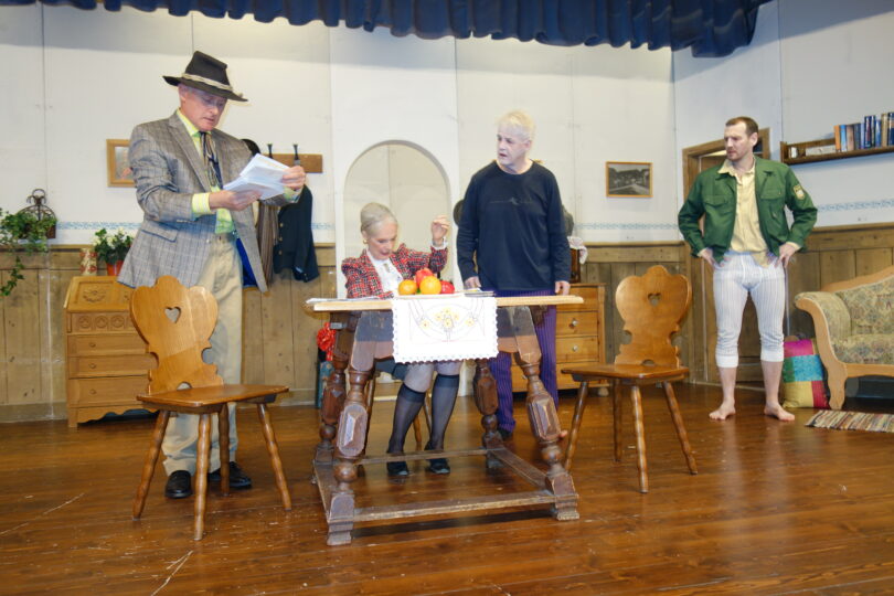 Während Schreinermeister Bömmerls Vetter Froschmeier (Beppo Landenhammer, von links) und seine Frau (Regina Wolfenstetter) überlegen, wo der Schatz versteckt sein könnte, verfolgen die Verstorbenen Bömmerl (Fred Hanrieder) und Polizeibeamter Stelzl (Simon Meier) als Geister das Geschehen.