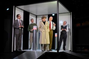 Die fünf Forscher (v.l.n.r.): Ed Teller (Luca-Noél Bock), Paul Erdös (Fabian Lichottka), Robert Oppenheimer (Britta Bayer), Jenö Wigner (Axel Meinhardt), und Leó Szilárd (Marco Dott)