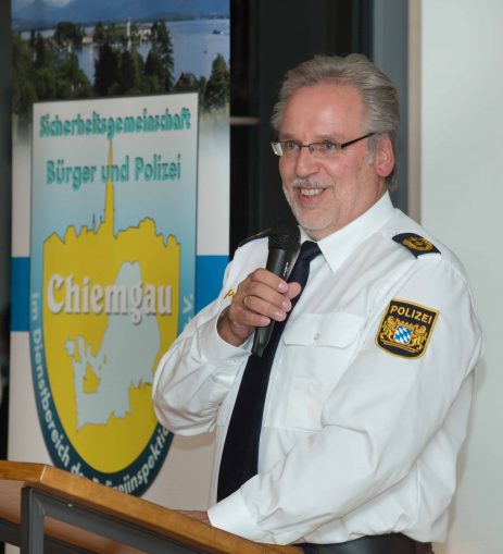 PP Kopp stellte fest, dass angesichts der Tatsache dass im Bereich der PI Prien die niedrigste Kriminalitätsrate seit 20 Jahren verzeichnet werden konnte, die Welt hier ein Stück weit in Ordnung ist. Neben der objektiv sehr guten Sicherheitslage spiele auch das subjektive Empfinden eine wichtige Rolle. Sicherheit ist eine „Vertrauenssache“ und die Menschen in der Region haben Vertrauen in „Ihre Polizei“. Dazu habe auch der Verein mit seinen Aktivitäten beigetragen. Für ihn sei die vor 25 Jahren gegründete Sicherheitsgemeinschaft ein „Werbeträger für die Polizei“, so Polizeipräsident Robert Kopp.