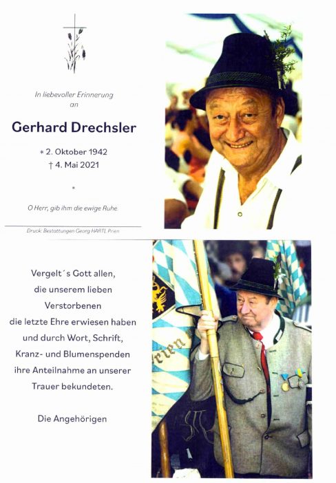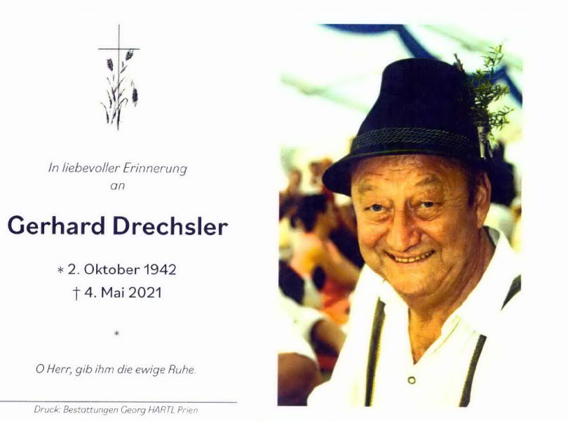 „Gerd wuchs in der Nachbargemeinde Rimsting auf, er verlor mit vier Jahren bereits seinen Vater und heiratete im Jahr 1968 seine im Jahr 2008 verstorbene Frau Marianne. Leider blieb dem Paar ein Kinderwunsch versagt, so dass er mit seinen Nichten und deren Familien ein enges Familienleben pflegte. Für sie war er stets und in vielen Situationen hilfsbereit zur Stelle“ – so die Trauerrednerin Sabine Eder, die hinzufügte: „Als gelernter Elektro-Installateur und Mitarbeiter der Priener Firma Löw war er für seinen Fleiß bekannt, er kümmerte sich auch um die richtige Elektrizität auf den von ihm gepachteten Almhütten“. Eine besonders enge und freundschaftliche Verbindung pflegte er mit der Gebirgsschützenkompanie Prien. Wie Hauptmann Rudi Holthausen in seinem Nachruf sagte, übernahm Gerd Drechsler bereits im Jahr 1973 bei seinem Eintritt in den Verein die Aufgabe als Zweiter Fähnrich, weiters sagte Holthausen: „Von 1976 bis 2016 trug er verlässlich, gewissenhaft und mit Stolz bei allen Ausrückungen der Kompanie als Erster Fähnrich die Fahne“. Aufgrund seiner langjährigen Verdienste wurde Drechsler im Jahr 2006 vom Bund der Bayerischen Gebirgsschützen mit der „Goldenen Verdienstmedaille am Blauen Band“ sowie im Jahr 2012 mit der „Ehrenmedaille der Kompanie in Gold“ ausgezeichnet. Bei der Jahreshauptversammlung im Jahr 2016 ernannte die GSK Prien Gerd Drechsler zu ihrem Ehren-Fähnrich. „Der Gerd war ein überzeugter Gebirgsschütze, der uns auch ob seiner Geselligkeit bei den Kompanieabenden im Stüberl als geschätzter Unterhalter und als leidenschaftlicher Schafkopfer fehlen wird“ – so Hauptmann Holthausen. Dem Verstorbenen galt im Priener Friedhof ein dreifacher Ehrensalut, der von Oberleutnant und Hauptmannstellvertreter Sepp Kirner kommandiert wurde. Die musikalische Gestaltung der Trauerfeier übernahm das Laubensteiner Flügelhorn-Duo. Am offenen Grab senkte sich zum letzten Gruß auch die Fahne der GSK Söllhuben, bei dieser sowie bei der Kompanie in Bad Reichenhall war Gerd Drechsler ein förderndes Mitglied.