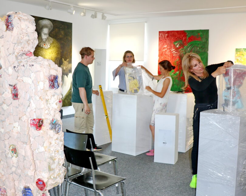 Nun ist es bald soweit: in wenigen Tagen eröffnet die Ausstellung „Art Chiemsee – Kunst am bayerischen Meer“ in der Galerie im Alten Rathaus. Über 200 Exponate wurden vergangene Woche von der Düsseldorfer Galerie Geuer & Geuer und dem artstar Verlag bereitgestellt. Seitdem herrscht in den Räumlichkeiten in der Alten Rathausstraße 22 reger Betrieb – es wird eifrig ausgepackt, gehämmert und aufgehängt. Auf Sorgfalt und Präzision kommt es jetzt an. Die Assistentin der PriMa-Geschäftsführerin und studierte Kunsthistorikerin, Martina Lehmann, hat die Koordinations- und Realisierungsarbeiten übernommen. „Wir liegen gut in unserem Zeitplan“, sagt Lehmann. Im Austausch mit der Arbeitsgruppe, bestehend aus mehreren PriMa-Mitarbeiter:innen, der Kunstvermittlerin Ingrid Fricke und Verantwortlichen des Art Star Verlages Düsseldorf nimmt die Ausstellung mehr und mehr Gestalt an. Beherzt und konsequent erledigen die Mitarbeiter der Gärtnerei ihre Aufgaben. Behutsam wurden die zeitgenössischen Kunstwerke an ihren jeweiligen Platz getragen. Unter den angelieferten Objekten befinden sich Arbeiten von internationalen Top-Künstlern wie Gottfried Helnwein, Günther Uecker, Heinz Mack, Gerhard Richter, Julian Schnabel, Damien Hirst, David LaChapelle, Jonathan Meese, Markus Lüpertz, A.R. Penck, Jeff Koons, Tony Cragg, Hermann Nitsch, Igor Oleinikov, Stefan Szczesny, Jiri Dokoupil, David Gerstein, Gaby Fey, Ben Buechner sowie weiterer Kunststars. Spätestens zur Eröffnung am kommenden Samstag, 8. Juli wird alles an der richtigen Stelle sein. Danach können die Besucher:innen bis zum Sonntag, 24. September 2023 Kunst der Spitzenklasse in Prien am Chiemsee erleben.