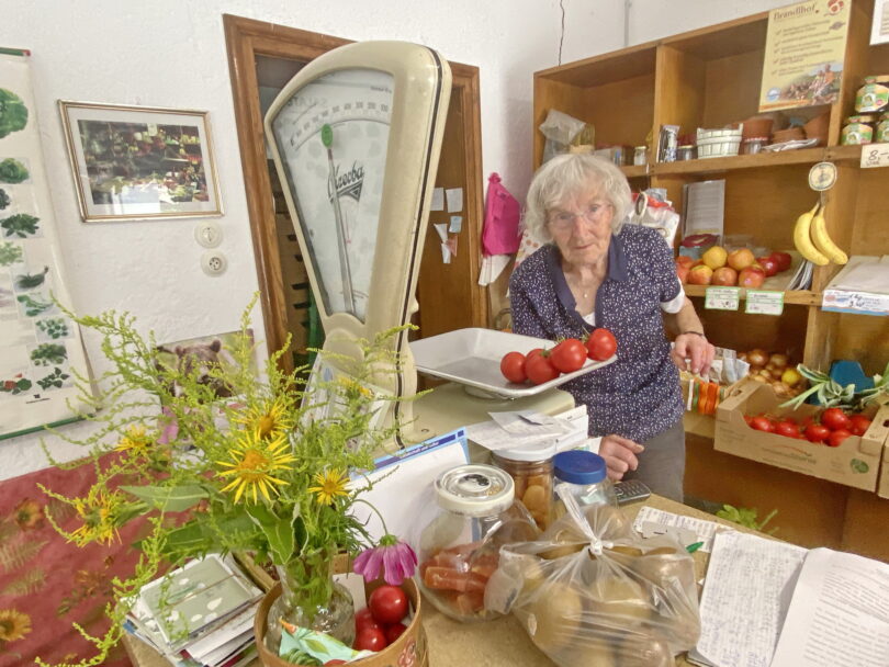 Irmgard Krumrey lebt genügsam und damit auch vom Laden. Laufkunden hat sie weniger, dafür aber viele und treue Stammkunden, die die Sorgfalt und Frische bei den Waren zu schätzen wissen. „Viele meiner Kunden sind natürlich Priener, aber auch aus der Umgebung kommen die Leute immer wieder“. Diese Stammgäste wissen es zu schätzen, dass regionale Produkte aus dem eigenen Garten wie Salat, Kohlrabi, Lauch, Sellerie, Zwiebel, Kraut, Gurken, Zuchhini oder Kürbisse ebenso kommen wie schön zusammengestellte Blumensträuße. Natürlich kann der Preis im Krumrey-Laden nicht mit den (Sonder-)Angeboten der Priener Discounter mithalten. Deswegen – so Irmgard Krumrey – kommen auch wenig Urlaubsgäste zu ihr.