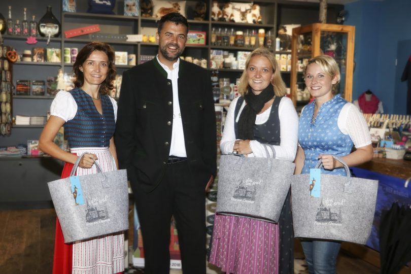 Foto: „I gfrei mi drauf!“-Tasche – ein passendes Accessoire zu jedem Trachtenoutfit: (v.l.n.r.) Andrea Hübner, Geschäftsführerin der Prien Marketing GmbH, Wolfgang Sedlmeir, Geschäftsinhaber von servus.heimat am Chiemsee und die PriMa-Mitarbeiterinnen Nina Mroczeck und Bettina Zaufall.