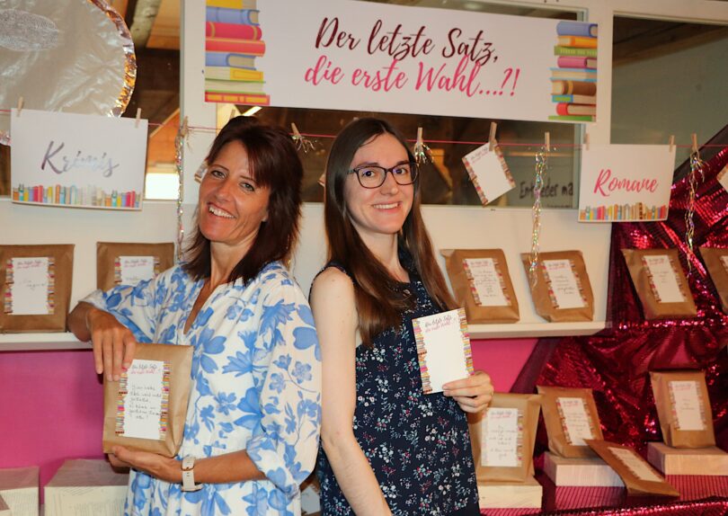 Bericht und Bild: Markt Prien a. Chiemsee – Der letzte Satz, die erste Wahl…?! – Büchereimitarbeiterin Bianca Radlinger und Büchereileiterin Melanie Schieber machen letzte Vorbereitungen für die Buch-Überraschungsaktion.