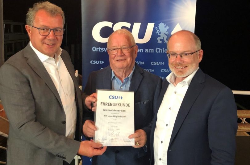 Michael Anner sen. aus Prien am Chiemsee wurde vom CSU Kreisvorsitzenden und Landtagsabgeordneten Klaus Stöttner auf der Jahreshauptversammlung der CSU Prien für 60 Jahre Mitgliedschaft mit der Ehrenurkunde der CSU geehrt. Als Michael Anner sen. als 18- Jähriger vor 60 Jahren Mitglied der CSU wurde, war Konrad Adenauer noch Deutscher Bundeskanzler und ein junger Franz Josef Strauß Bundesverteidigungsminister.  Von 1972 bis 2008 war Michael Anner 36 Jahre lang Mitglied des Marktgemeinderates in Prien, davon sechs Jahre als 2. Bürgermeister. Er war 1970 Gründer der Jungen Union Prien am Chiemsee und führte diesen Verband sechs Jahre lang als Vorsitzender. Fast 50 Jahre wirkte er im Ortsvorstand der CSU Prien am Chiemsee. „Diese Bodenständigkeit gepaart mit großer Verantwortung für unser Land sind ein Musterbeispiel für unsere CSU“ so der Landtagsabgeordnete Klaus Stöttner.