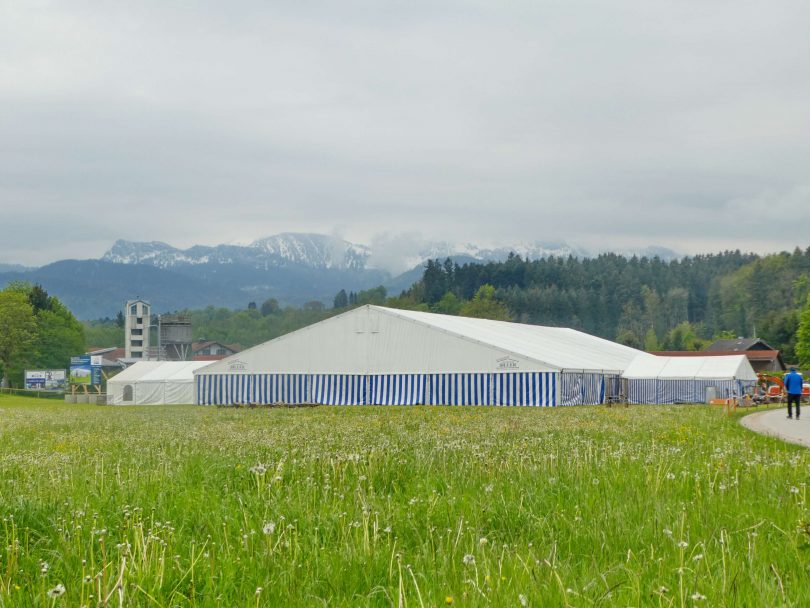 Grüne Wiesen und immer noch mit Schnee bedeckte, weiße Chiemgauer Berge umrahmen derzeit das Festzelt in Prien, das in der Bernauer Straße für die Priener Festwochen aufgestellt worden ist und derzeit auch eingerichtet wird. Das Fest mit den Jubiläen der Feuerwehr (150 Jahre) und der Blaskapelle (190 Jahre) beginnt am Donnerstag, 23. Mai um 19 Uhr mit dem Bieranstich.