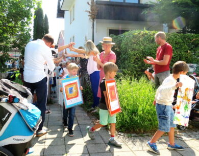Nach dem Gottesdienst ging es für die baldigen Schulkinder durch ein Spalier zurück in den Kindergarten, wo bei strahlendem Sonnenschein ein buntes Sommerfest im Garten gefeiert wurde. Mehrere Spielstationen, ein reichhaltiges Buffet und viele weitere Highlights sorgten für fröhliche Stunden mit Eltern, Großeltern, Geschwistern und dem Kindergarten Team.