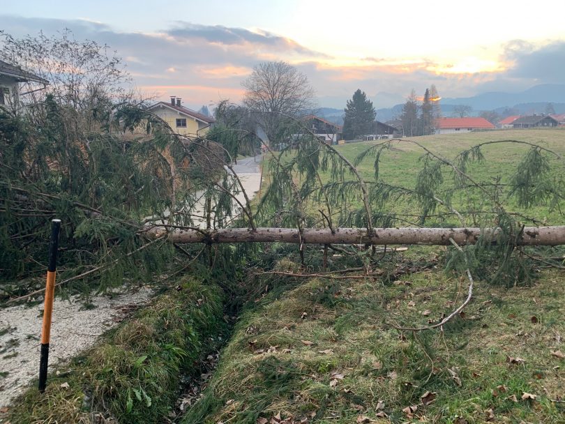 Der nächtliche Föhnsturm hat zuweilen auch für einige Schäden in den heimischen Wäldern gesorgt – wie diese Bilder vom Waldweg in Prien-Prutdorf zeigen, fiel diese Fichte in den Garten eines Wohnhauses ohne allerdings nennenswerten Schaden angerichtet zu haben.