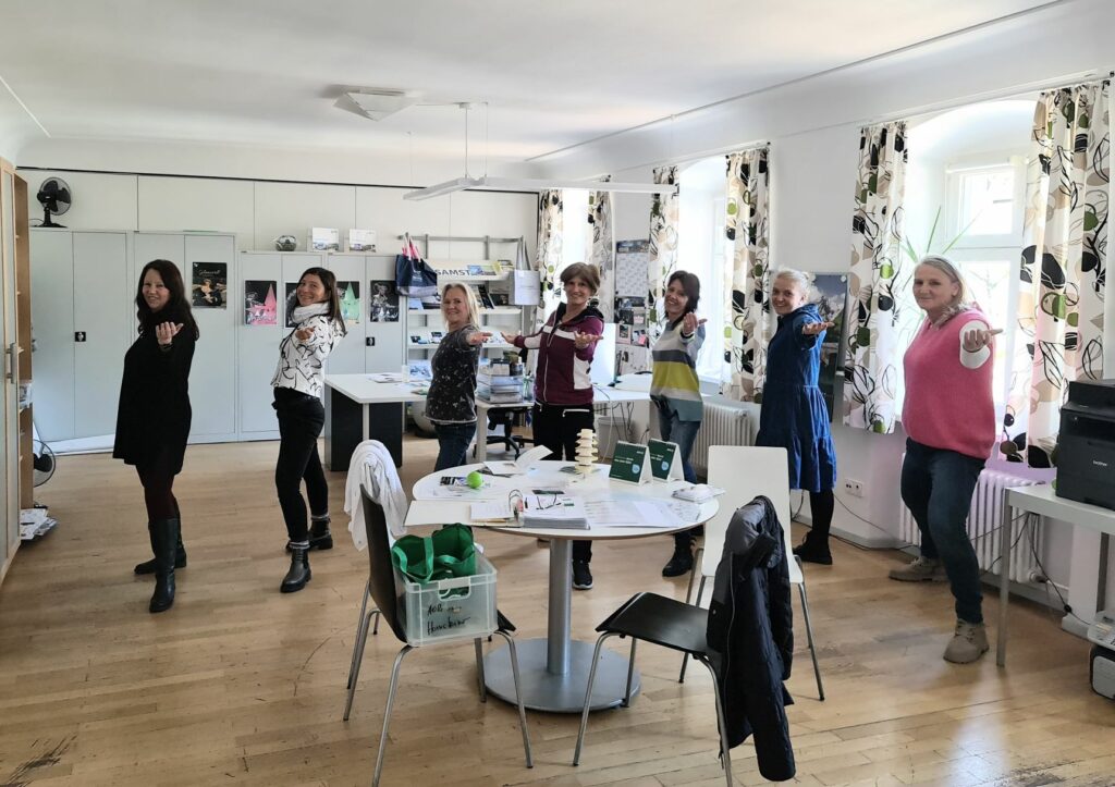 Einmalige Schulung zum Thema „Bürogymnastik“ mit der AOK-Mitarbeiterin Evi Hornsteiner (im Bild mittig). Wöchentlich biete die Büchereimitarbeiterin Moni Zech (siebte von links) ihren Kolleg:innen bei der PriMa das hausinterne Angebot „Fit mit Moni“.