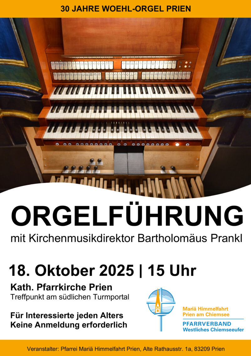 Die Weihe der herausragenden Priener Woehl-Orgel jährt sich heuer an Kirchweih zum dreißigsten Mal. Nach dem Orgelsommer und dem Chor- und Orchesterkonzert am vergangenen Sonntag, lädt Kirchenmusikdirektor Bartholomäus Prankl Interessierte jeden Alters zur Orgelführung am Kirchweihsamstag, 18. Oktober um 15 Uhr ein. Treffpunkt ist außen am südlichen Turmportal.