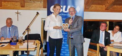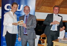 Bevor Landtagsabgeordneter und CSU-Kreisvorsitzender Klaus Stöttner die Wahlen durchführte, erklärte Annette Resch, warum Prien mehr kann. Zu ihren Themen nannte das „Priener Kind“ mit Abitur im Ludwig-Thoma-Gymnasium einige Beispiele. Dazu gehörten unter anderem: Mehr Transparenz und Kommunikation, mehr Schnelligkeit bei verschiedenen Projekten (z. B. Bahnhofs-Vorplatz oder Prutdorf-Umgehung), mehr Verkehrsentlastung, mehr Parkraum mit Parkhäusern am Bahnhof, an der Beilhackstraße und mit einem Parkleit-System, mehr für Radfahrer (z. B. einem Rad-Schnell-Weg vom Zentrum zum Chiemsee), mehr für das IST-mobil in der Region Chiemsee (für dessen Zustimmung sich Annette Resch als Jugendreferentin einsetzte), mehr Verständnis für die Landwirtschaft („Denen brauchen wir nicht täglich die Arbeit erklären“) und mehr Interesse für Tourismus und Wirtschaft („Gute Arbeitsplätze sind wichtig“). Mit einer Vision überraschte die Bürgermeister-Kandidatin als sie sagte: „Mir schwebt vor, ein Haus der Vereine zu schaffen, kulturell und sozial, gerade für die Musikschule brauchen wir räumliche Verbesserungen, Ideen und Konzepte wären schon vorhanden“ – so Annette Resch in ihrem Bemühen, Prien jeden Tag ein Stück besser zu machen. Um dies auch umzusetzen bekam sie an diesem Abend von Christian Simon ein persönliches Ideen-Buch, in dem sich in den nächsten Monaten Bürger, Firmen, Vereine, Organisationen und weitere Gesprächspartner mit Notizen wieder finden werden.