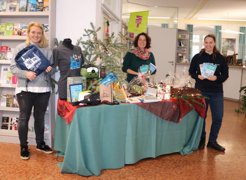 Kerzenschein, Plätzchenduft und Tannengrün – die Adventszeit ist besinnlich und schön, wäre da nur nicht die hektische Suche nach dem perfekten, möglichst außergewöhnlichen Geschenk. Auch heuer greifen die Mitarbeiterinnen der Prien Marketing GmbH (v.l.n.r.) Nina Mroczeck von Gliczinski, Gabi Oberloher und Sarah Völk gemeinsam mit ihren Kolleginnen und Kollegen dem Christkind etwas unter die Arme und helfen gerne ein passendes Präsent zum Fest der Liebe zu finden. Auf einem weihnachtlich dekorierten Tisch im Priener Tourismusbüro, Alte Rathausstraße 11, finden Einheimische und Gäste originelle Geschenkideen. Und das Beste: Alle Präsente, wie beispielsweise die nachhaltig hergestellte Gürteltasche, die Bücher „100 Genussorte“ und „Nixerl“, die Plüschlokomotive Wiggerl, das „See-Gipfel-Ticket“ sowie die „Chiemsee Golfcard“ – sind bereits liebevoll verpackt.