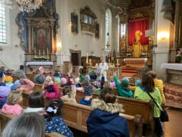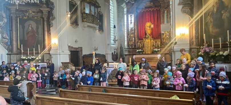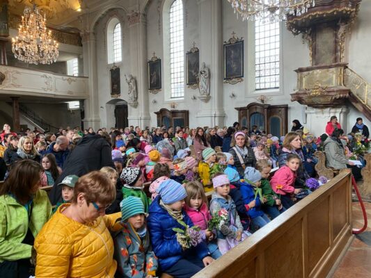 Mitte Mai trafen sich die Kinder des Katholischen Kindergartens zu ihrer traditionellen Maiandacht in der Pfarrkirche Mariä Himmelfahrt in Prien. Jedes Kind brachte selbstgepflückte Blumen und duftende Blüten zu Ehren der Heiligen Maria mit.