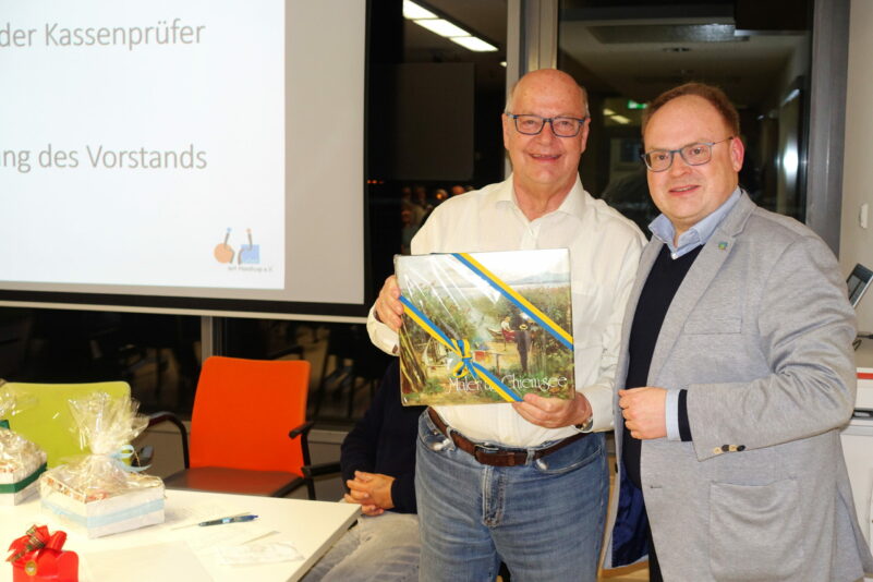 - Bürgermeister Andreas Friedrich bedankte sich beim bisherigen Vorstand Günther Bauer mit einem Chiemseemalerbuch