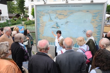 Die Seeführung vom Festland aus findet jeden Freitag bis einschließlich 11. Oktober 2019 auf einer kurzen auch für Rollstuhlfahrer geeigneten Geh- und Verweilstrecke entlang dem Chiemseeufer in Prien statt. Orts- und Gästeführerin Helga Schömmer hält jede Menge humoristische Details, kuriose Zahlen und Fakten über das Bayerische Meer bereit.