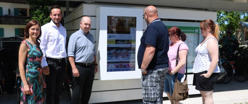 Bildunterschrift: Bei Urlaubern ist der neue Gäste-Infoterminal am Hafen Prien/Stock, Visasvis von dem Bürogebäude der Chiemsee-Schifffahrt, bereits gut angenommen: (v.l.n.r.) Ein Fazit, welches die Geschäftsführerin der Prien Marketing GmbH Andrea Hübner und der Leiter des Tourismusbüros Florian Tatzel bei ihrer Besichtigung am Montag, 3. Juni 2019 zogen. Zu den Touristikern gesellte sich der Junior-Geschäftsführer der Chiemsee-Schifffahrt Ludwig Feßler KG Michael Feßler, der sein Gelände für die Montage zur Verfügung stellte.