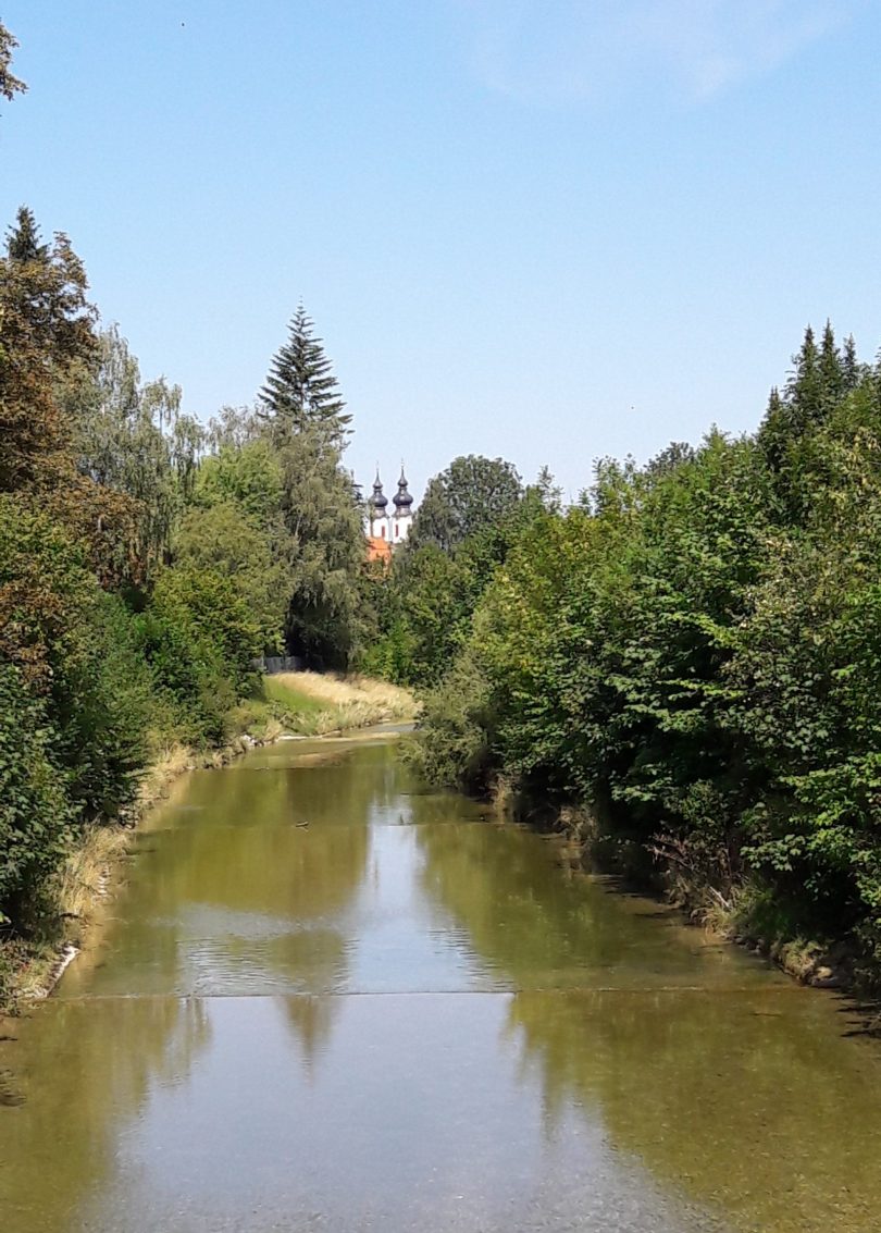 Zu herrlichen Spaziergängen laden dieser Sommertage die Witterungsbedingungen und die schönen Chiemgauer Landschaften ein – wie zum Beispiel diese Aufnahme von einer Prien-Brücke mit Blick zur Aschauer Kirche zeigt.