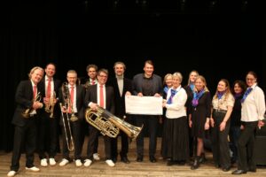 Einen symbolischen Scheck über Spenden in Höhe von 25.000€ übergaben die Brassmatiker (von links Dr. Henning Büscher, Dr. Dominik Schreuhn, Dr. Bernhard Frey, Dr. Christian Alber, Dr. Benedikt Wittmann) und Dr. Alexander Simon sowie Prof. Dr. Michael Körner als Vertreter des Lions-Clubs an Beate Bolz, die Geschäftsführerin der Ökumenischen Sozialstation in Prien. (Foto: Lions-Club Chiemsee)