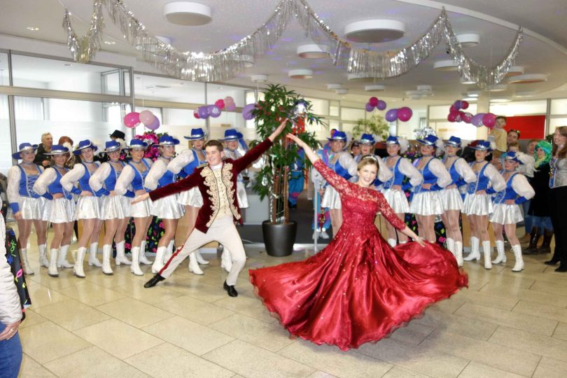 Es ist schon eine gute und schöne Tradition, dass die Priener Faschingsgesellschaft Prienarria am Unsinnigen Donnerstag einen Gast-Auftritt bei der örtlichen Sparkasse hat. Auch heuer erfreuten die Gilde, die Gardemädchen sowie Ihre Lieblichkeit Prinzessin Maria I. mit Prinz Josef I. mit farbigen und flotten Auftritten die Kunden der Sparkasse sowie die Mitarbeiter, die das Bankgebäude und sich selbst für den “Unsinnigen” entsprechend fröhlich hergerichtet hatten.