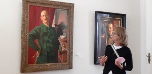 Ein prächtiges Selbstbildnis – zu diesem Zeitpunkt, um 1905, hatte es Julius Exter zu etwas gebracht, er stellte seine Bilder im Glaspalast aus. „Welche Farbe kann man auf dem Pinsel erkennen, den der Künstler auf seinem Selbstporträt in der Hand hält“, frägt die Kunsthistorikerin in die Runde. Die Antwort lautet Grün, wie sein markloser Maleranzug, der komplementär zu dem wallenden roten Vorhang im Hintergrund hervorsticht.