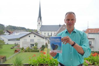 Foto/s: Hötzelsperger – Michael Leberle mit seinem Buch und mit Blick von seiner Wohnung auf die Priener Pfarrkirche „Maria Himmelfahrt“.