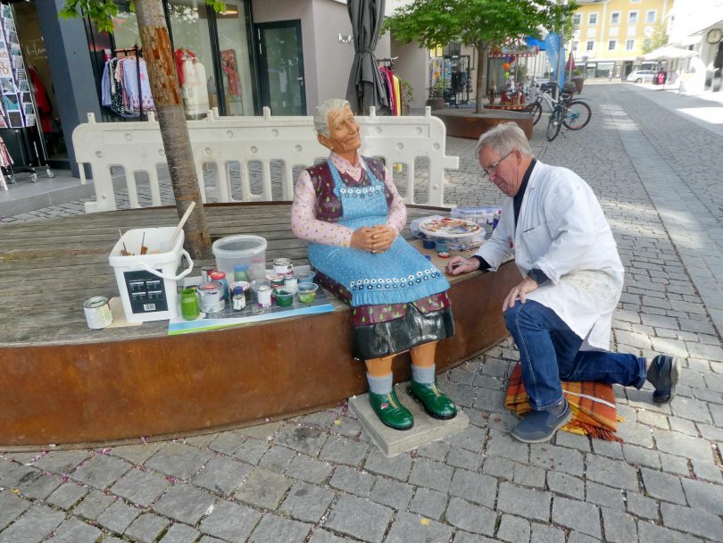 Zu den beliebtesten Mitbürgerinnen in der Marktgemeinde Prien gehört wohl die Beton-OMA, die in der Priener Bahnhofstraße ihre Platz hat und auf ihrem Bankerl immer wieder Jung und Alt zu sich, zum Verweilen und zu gemeinsamen Bildern einlädt. Doch in den letzten Monaten musste sie einiges aushalten und mitmachen. Die erste Schikane waren Schmierereien von Menschen, die weder Anstand noch Humor haben. Und dann kam der viele Schnee und mit ihm die schweren Schneeräumdienste, die wiederum zu einer Fußverletzung bei der OmA geführt haben. Gut, dass es in Prien mit Paul Panzer, Ehrenleutnant der Priener Gebirgsschützen Jemand gibt, der sich schon des öfteren und ehrenamtlich bei der Restaurierung von heimatlichen Kulturgütern eingesetzt hat. Bei seiner nunmehrigen „Operation“ nach dem „Schnee-Vorfall“ kamen viele Prienerinnen und Priener vorbei und dankten ihm für seine Fürsorge. Einer, der ebenfalls des Weges kam, war der Priener Verserlschreiber Ernst Reiter, was diesen zu folgenden Zeilen veranlasst hat: