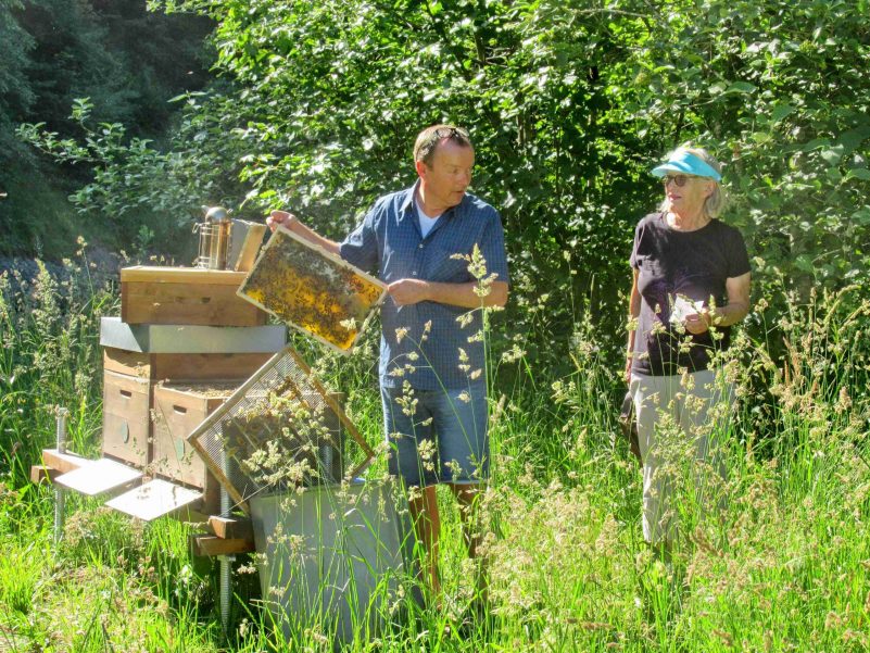 Fotos: Hötzelsperger – Berufsimker Stephan Walter bei seinen zwei Bienenvölkern im Priener Eichental nahe dem E-Werk zusammen mit Initiatorin und Gemeinderätin Angela Kind.