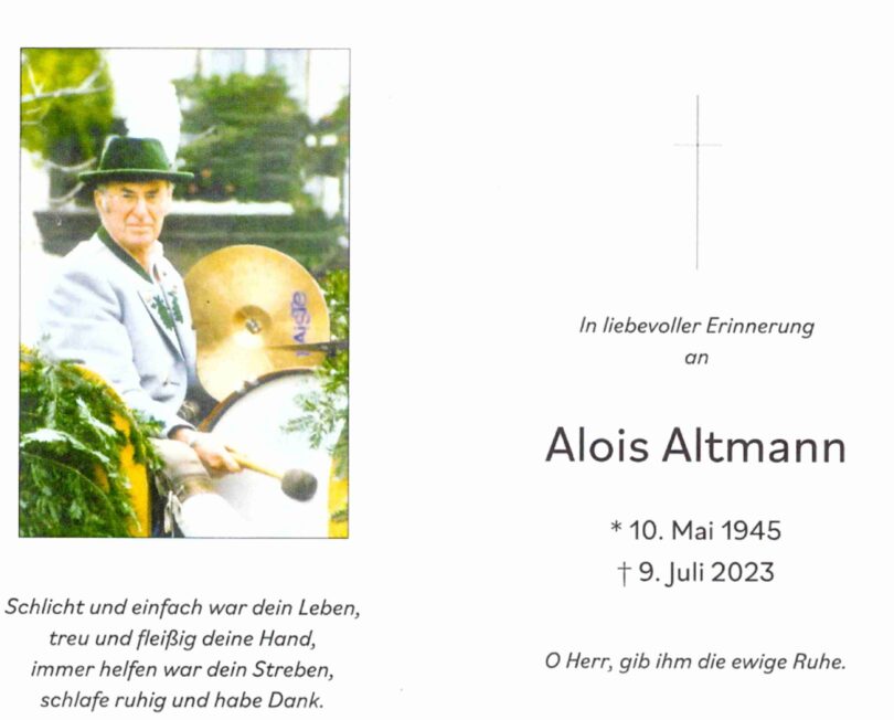 Alois Altmann aus Haimling bei Greimharting hat mit seiner Trommel mehr als 50 Jahre den Takt bei unzähligen Festlichkeiten vorgegeben. Nun wurde er mit großer blasmusikalischer Begleitung durch die Musikkapelle Prien unter der Leitung von Dirigentin Regina Huber im Alter von 78 Jahren nach längerer Zeit der Krankheit zu seiner letzten Ruhestätte begleitet.