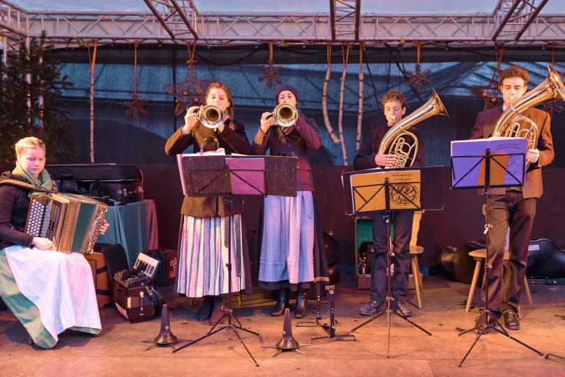 Foto: Prien Marketing GmbH – Rosenwink-Musi – Oh du Fröhliche! Nach der Corona-Zwangspause im vergangenen Jahr, freuen sich die Musikanten unter den Besucherinnen und Besuchern der drei „Platzerl“ des Priener Christkindlmarktes wieder Weihnachtsstimmung zu verbreiten.