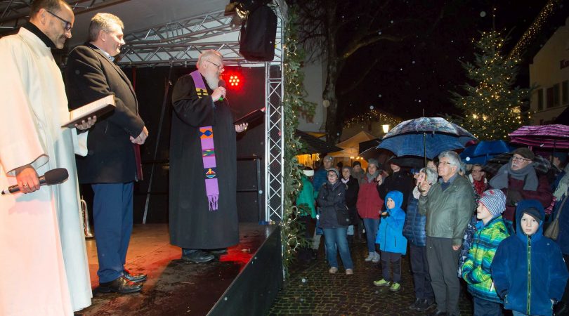 Zu Beginn animierte die hohe Geistlichkeit Frauen und Männer den Kanon „Seht die gute Zeit ist da“ zu singen. „Advent ist Vorweihnachtszeit, also Weihnachten vor Weihnachten oder sagen wir es ganz ehrlich – Weihnachten mit langem Anlauf“. Mit nachdenklichen, vielleicht auch provokanten Worten hinterfragten Werner Hofmann und Andreas Sargant den Advent in der heutigen, schnelllebigen Zeit. Karl-Friedrich Wackerbarth appellierte an die Wende in den Köpfen – an eine Zeit für Umkehr um gemeinsam für das Leben zu kämpfen. „Da der Glühwein zu den geistlichen Getränken gehört, fördert er vielleicht auch geistreiche Ideen“, so Wackerbarth und rief die Besucherinnen und Besucher dazu auf, auf Smalltalk zu verzichten und die Zeit hier auf dem Christkindlmarkt zu nutzen, große Themen wie die Klimawende anzugehen. „Noël est la fête de l`amour … – Weihnachten ist das Fest der Liebe, der Aufnahme und nicht des Ausgrenzens“, betonte Erster Bürgermeister Jürgen Seifert in seiner kurzen Ansprache, die er für die Gäste aus der französischen Partnergemeinde Graulhet übersetzen ließ.