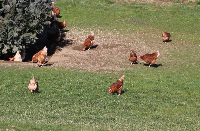 Bildunterschrift: In Elperting picken glückliche Hühner in den Wiesen.