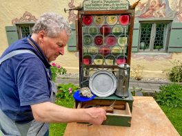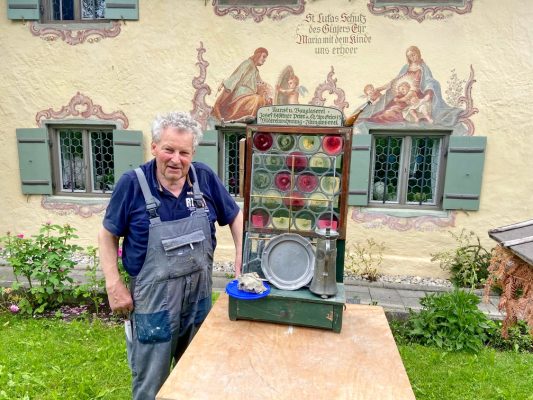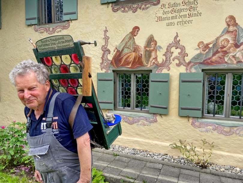 Glasermeister Sepp Stöttner erinnert mit Kraxe an frühere Zeiten