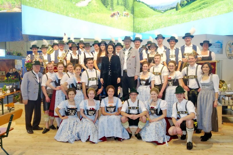 „Das freut mich sehr, dass ich mit den Prienern eine so tolle Gruppe aus meiner oberbayerischen Heimat hier in Berlin begrüßen kann“, so die Bayerische Landwirtschaftsministerin Michaela Kaniber, die erstmals in ihrem Amt in der Bayernhalle über 40 Aussteller willkommen heißen konnte. Und weiters sagte die Ministerin: „Den Berlinern und ihren Gästen wollen wir an den zehn Tagen die Vielfalt, Lebensfreude und den Genuß-Reichtum von Bayern zeigen, da passen die Trachtler- und Musikanten-Auftritte und Informationen auf der Bühne rund um das bayerische Brauchtum bestens dazu“. Das Gespräch mit Michaela Kaniber führte Regina Wallner aus Prien-Bruck, die für die Moderation der Bühnenauftritte von Musik- und Trachtengruppen aus ganz Bayern in der vom Samerberger Entenwirt bewirteten Biergarten zuständig ist. Die Priener Delegation wurde angeführt von den Bürgermeistern Jürgen Seifert und Hans-Jürgen Schuster sowie von Andrea Hübner von der Prien Marketing GmbH. „Die international beachtenswerte Ausstellung bietet eine große Anzahl von Kontakt-Möglichkeiten und ist eine hervorragende Werbeplattform“, so die Touristikerin Andrea Hübner, deren Werbebemühungen noch durch einen Informationsstand des Tourismusverbandes Chiemsee-Alpenland unterstützt wurde. „Wir waren schon ein paar mal dabei, wenn Priener zur Grünen Woche fuhren, aber die heurige Eröffnung war schon etwas ganz Besonderes, da macht es auch nichts, wenn Berliner Nächte ganz kurz sind“ – freute sich Stefan Hackenberg als Vorstand der Blaskapelle, der die Gelegenheit nutzte, um auf das Blaskapellen-Jubiläum und auf die Priener Festwochen hinzuweisen. Eigens geprobt hatten die Priener Trachtler für die Berlin-Auftritte, mit dem „Preana Marsch“ und mit dem „Chiemseer-Tanz“ und weiteren Darbietungen, was auch den Gefallen von Bayerns Trachtler-Landesvorsitzenden Max Bertl fand. Zufrieden zeigte sich sich auch Bürgermeister Jürgen Seifert, bei einem Gemeinschaftsfoto dankte er allen Mitwirkenden und auch der Volksbank Raiffeisenbank, die die Priener Auftrittsfahrten finanziell unterstützte. Nach dem Auftakt-Erlebnis gab es für die Priener noch einige weitere Aufgaben und Auftritte, unter anderem auch für die Prienarria, über deren Abend mit dem Berliner Karnevalsverein wir noch gesondert berichten.