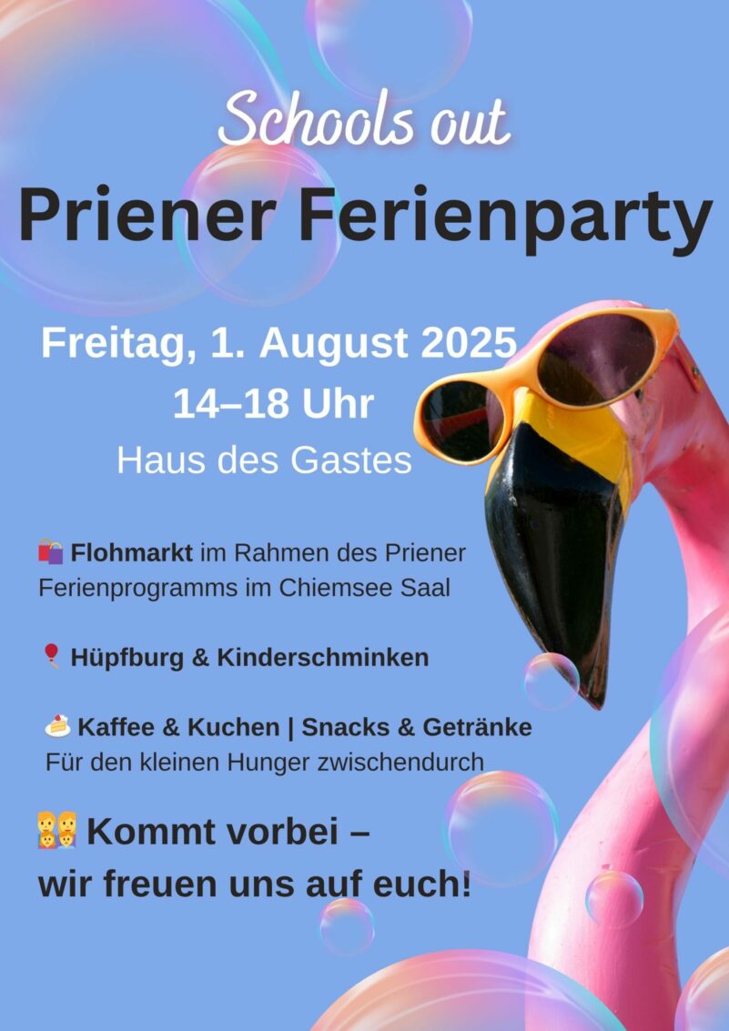 Am 1. August 2025 von 14 Uhr bis 18 Uhr lädt das Ferienprogramm alle Kinder und Familien zur Priener Ferienparty im Haus des Gastes (Chiemsee-Saal) ein! In diesem Jahr bekommt der traditionelle Kinderflohmarkt einen neuen Rahmen – mit noch mehr Abwechslung und Spaß für Groß und Klein.