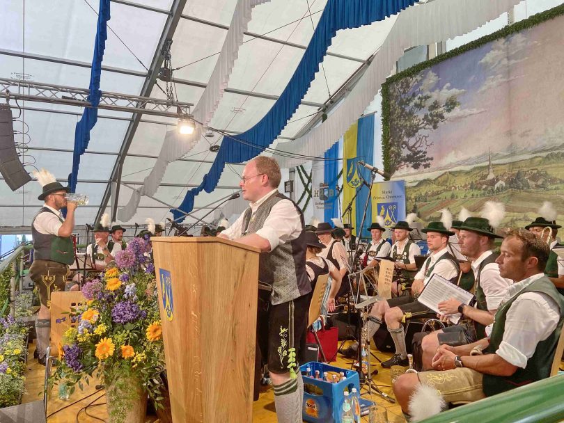 Mit dieser Einschätzung war er nicht allein, im Gegenteil, aus vielen anderen Rückmeldungen kamen gleichlautende Signale. Festwirt Wolfgang Kirner und Resi Bartl als Verantwortliche für Küche und Service kennen sich schon von vielen gemeinsamen Festen, aber diesmal war es etwas Besonderes als sie sagten: „Einmal wegen dem, weil Corona uns lange ausbremste aber auch zum Anderen, weil es ein so gutes Miteinander gab, es war einfach wirklich schön, auch wenn Hitze und Gewitter manchen Besucher zurückhielt. Unterm Strich war es gut. Im übrigen sind wir schon bald ab Ende Juli wieder gemeinsam dabei, wenn beim Trachtenverein Schleching das Chiemgauer Gautrachtenfest ist, darauf freuen wir uns schon ganz sakrisch“. Eine positive Bilanz zogen auch Bürgermeister Andreas Friedrich und seine beiden Geschäfts- und Festleiter Andreas Hell und Donat Steindlmüller, ihr Rückblick lautete: Der Markt Prien kann auf eine gelungenes Jubiläumsfest und zwei attraktive Markttage zurück blicken. Es war ein Fest für alle Prienerinnen und Priener, das auch nur durch die gute Zusammenarbeit vieler fleißiger Hände möglich gemacht wurde. Der Dank gilt hierbei ganz besonders den Trachtenvereinen und Feuerwehren aus Prien und Atzing, der Jungbauernschaft und der Musikkapelle Prien sowie den Mitarbeiterinnen und Mitarbeitern der gesamten Marktverwaltung inklusive dem Bauhof und seinen Gewerken für die tolle Unterstützung“. Hinzugefügt wurde gebeten, dass Helfer zum Zeltabbau herzlich willkommen sind und dieses genauso so toll klappt wie der Aufbau und die Durchführung der ganzen Festtage. Dieser Appell gilt allen Priener Vereinen und Bürgern, die mithelfen wollen am Mittwoch 29. Juni ab 8 Uhr oder ab mittags beim Abbau des Festzeltes und beim Räumen des Festplatzes. Stellvertretend für alle Ortsvereine und helfenden Personen überreichte Bürgermeister Andreas Friedrich Blumen und Hochprozentiges an Festwirt Wolfgang Kirner, an Bedienungs-Chefin Resi Bartl und an Florian Krempl von der Priener Jungbauernschaft.