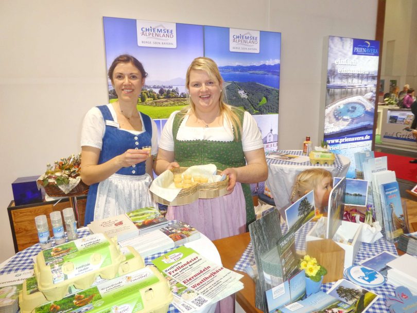 Der bayerische „Genuss-Ort“ Prien präsentiert sich bei der heurigen Freizeit- und Reisemesse f.re.e in München unter anderem mit einem neuen Direktvermarkter-Verzeichnis und mit einer Prospekt „Genuss-Reise“. Als einer von einhundert bayerischen Genussorten hat Prien – so die neue Broschüre- neben kulinarischen Schmankerln auch viel Kultur zu bieten. Unsere Aufnahme zeigt am Gemeinschaftsstand Stephanie Vorleitner vom Tourismusverband Chiemsee-Alpenland (li.) zusammen mit Wastlhof-Bäuerin Maria Riepertinger als Vertreterin der Priener Direktvermarkter, sie präsentierte am Eröffnungstag Freilandeier, Eierlikör, Eier-Nudeln und Selbst-Gebackenes.