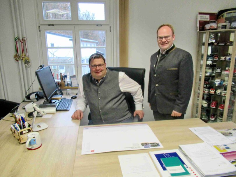 - Im Rathaus von Rod an der Weil: Priens Bgm. Andreas Friedrich schaut seinem Kollegen Bgm. Götz Esser (li.) über die Schultern