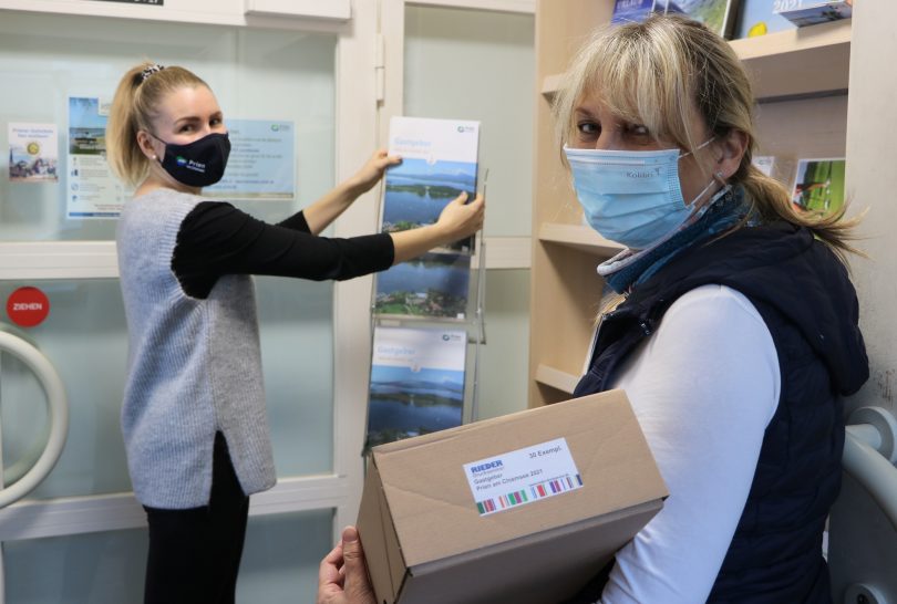 Foto: Prien Marketing GmbH: (v.l.n.r.) Druckfrisch eingetroffen – die PriMa-Mitarbeiterinnen Magdalena Berka und Gaby Hauk befüllen den Prospektständer mit dem Gastgeberverzeichnis 2021. Aufgrund der coronabedingten Schließung des Haus des Gastes ist die Broschüre ab Freitag, 18. Dezember 2020 rund um die Uhr im Vorraum des Tourismusbüros Prien, Alte Rathausstraße 11, erhältlich. Das Gastgeberverzeichnis wird außerdem auf der Webseite www.tourimus.prien.de online zum Blättern angeboten und kann bei den Mitarbeiterinnen unter Telefon +49 8051 6905-0 oder info@tourismus.prien.de bestellt werden.