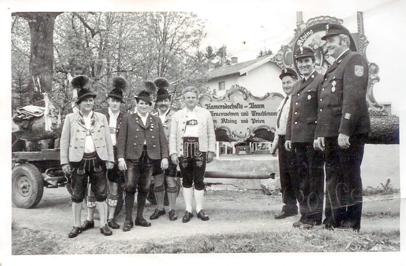 Foto: Berger: Zur Gebietsreform am 1. Mai 1978 brachten die Atzinger Vereine einen Kameradschaftsbaum nach Prien, einer der Initiatoren war Anton Harntasch. Die Aufnahme zeigt von links: Michael Guggenbichler (1. Vorstand GTEV Prien), Werner Krauss und Paul Schlosser (2. u. 1. Vorstand GTEV Atzing), Peter Donauer (Kurdirektor und 2. Vorstand GTEV Prien), Lorenz Kollmannsberger (1. Bürgermeister der Marktgemeinde Prien), Hubert Summerer (1. Vorstand FFW Atzing), Anton Harntasch (1. Kommandant der FFW Atzing) und Klaus Herzinger (1. Kommandant der FFW Prien).