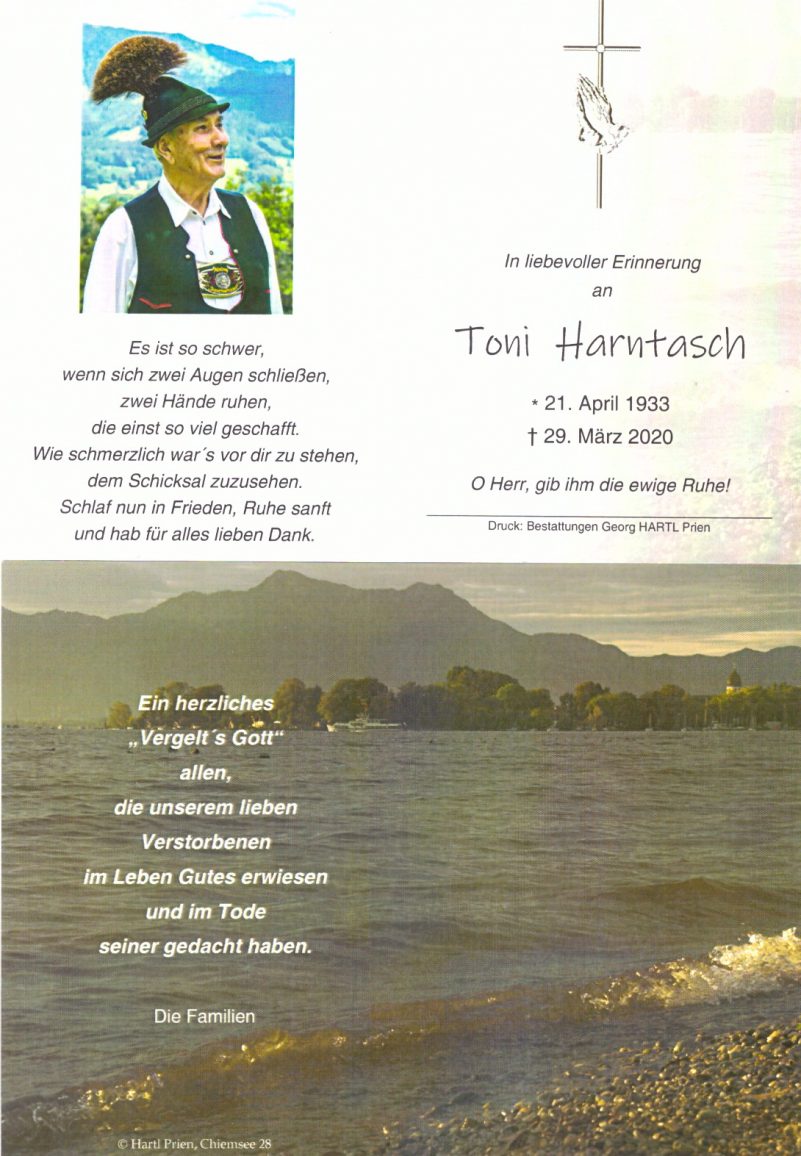 Ein feierliches Jahres-Gedächtnisamt wurde für den im April des vergangenen Jahres im Alter von 86 Jahren verstorbenen Anton Harntasch in der Pfarrkirche „Mariä Himmelfahrt“ in Prien gefeiert. Nachdem bei der Beerdigung im Vorjahr nur 15 Personen coronabedingt teilnehmen konnten, war es beim Jahramt einem etwas größeren Kreis von Verwandten sowie den Vertretern der Gemeinde und Vereine möglich, sich vom Verstorbenen zu verabschieden.