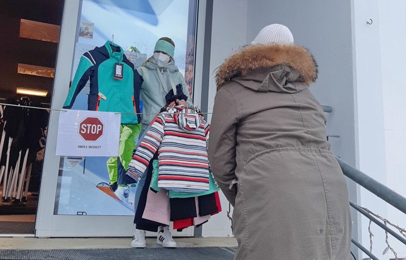 Foto: Eine Kundin besichtigt die bestellte Ware bei Intersport Kaiser in Prien, die ihr dann kontaktlos ausgehändigt wird.