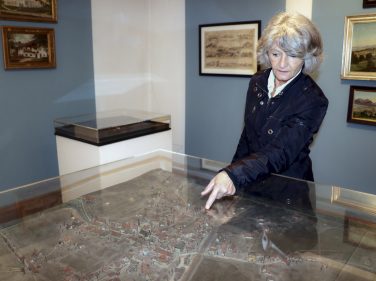 Bildunterschrift: Im ersten Stock des Priener Heimatmuseums zeigt Judith Schmidbauer auf ein Ortsmodell von 1895. Hier kann man noch die ebenerdige gefährliche Überquerung der Bahnstrecke München – Salzburg erkennen, aus deren Erdreich 14 Jahre später die künstlich aufgeschüttete Landzunge entstand.