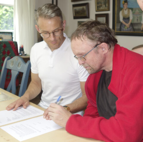 Fotos: – Unterzeichnung der Schenkungsurkunde durch Dr. Thomas Schindler (li.) und Künstler Mathias Stampfl im Beisein von dessen Mutter Helga Stampfl