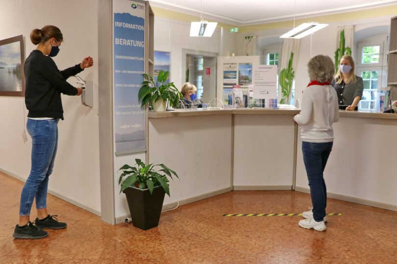 Foto: Prien Marketing GmbH – Hygienekonzepte werden im Haus des Gastes umgesetzt. Die Bücherei Prien und das Tourismusbüro Prien bereiten sich auf den 11. Mai, Tag der Wiedereröffnung vor.